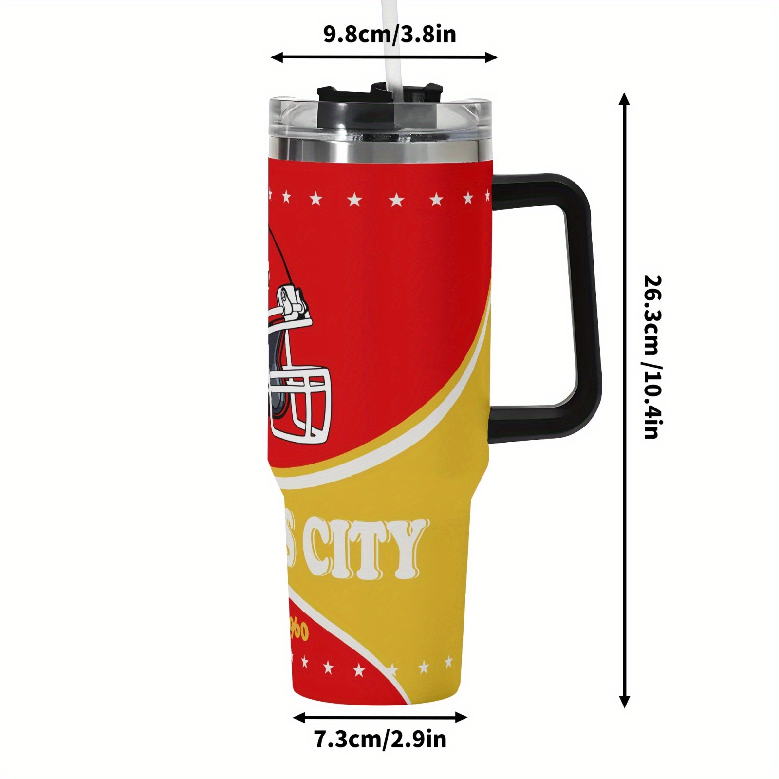 The straw integrates smoothly into the overall design. The tumbler maintains a streamlined profile despite its size. The visual presentation suits sports fans seeking themed drinkware with everyday appeal. The color layout and graphic details create a strong sports-inspired look. The design remains suitable for daily routines and seasonal gifting needs.