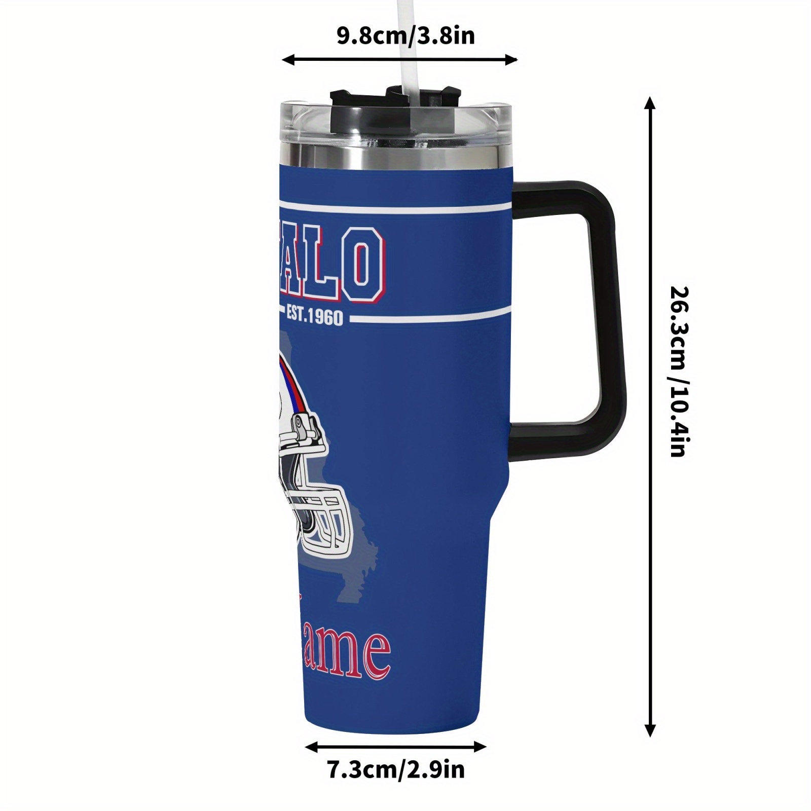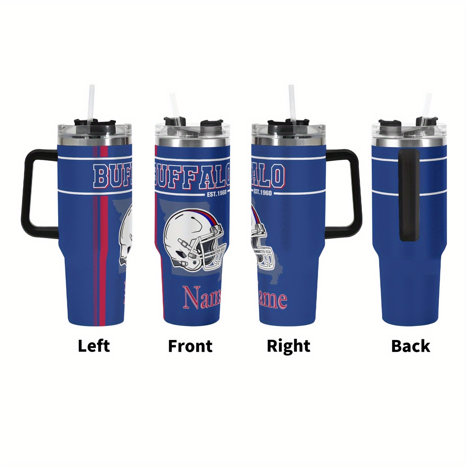 Buffalo Bills Themed Travel Mug is a 40oz travel mug designed for daily drink routines with a football-themed wrap layout similar to the image shown. The design includes bold “Buffalo” text placement, a helmet graphic, and a name customization area, creating a team-inspired look that stays visible from multiple angles, including the left, front, right, and back views. This mug includes a handle, a fitted lid, and a straw, making it suitable for commuting, desk use, school schedules, outdoor outings, and travel plans.