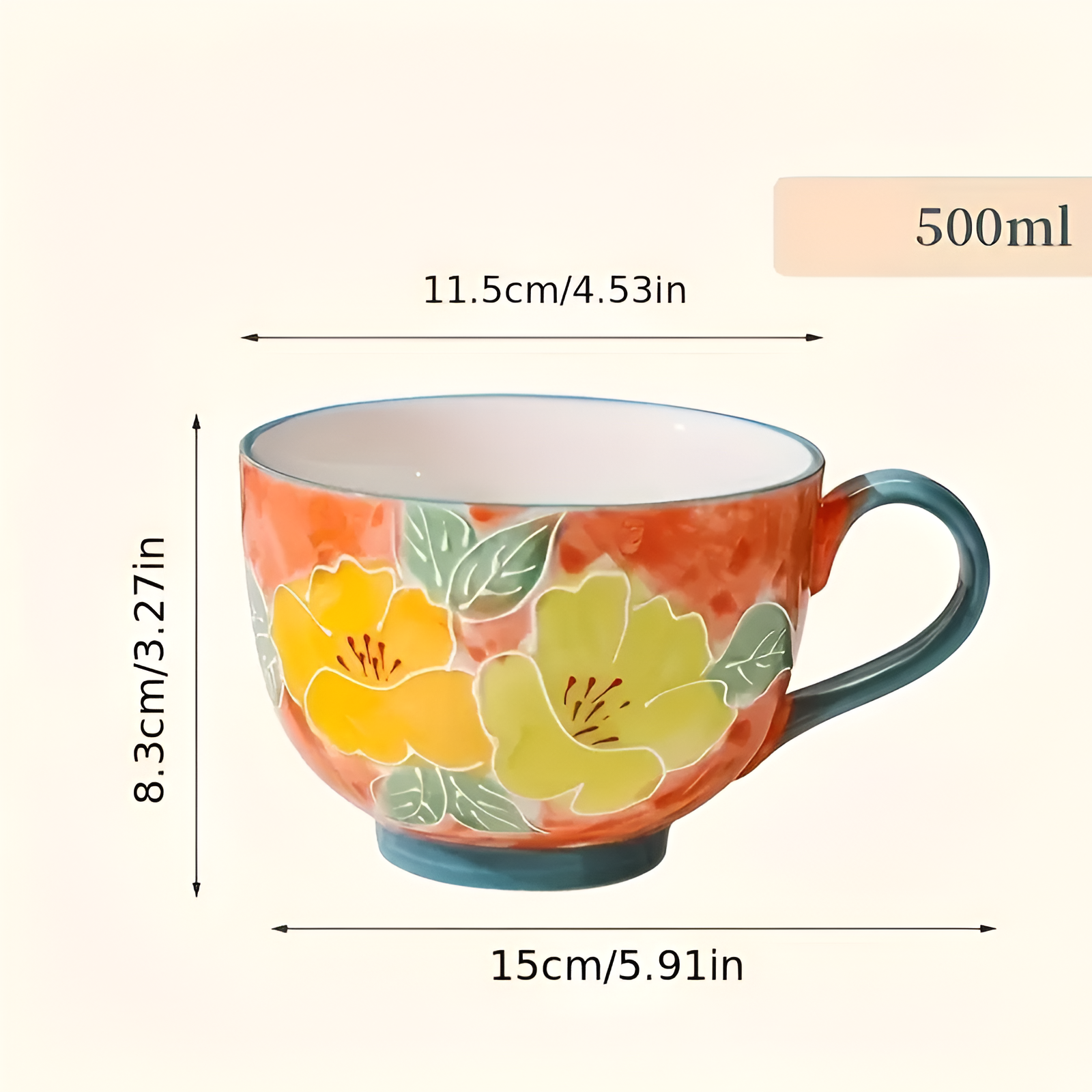 Unlike flat colors, the floral application brings dimension. Each line and shape follows the curvature of the cup to produce flow without repetition.