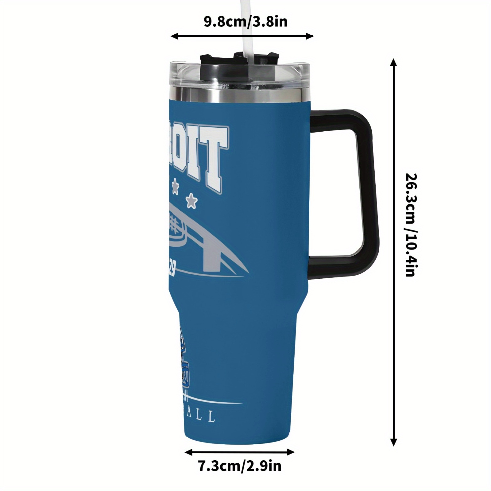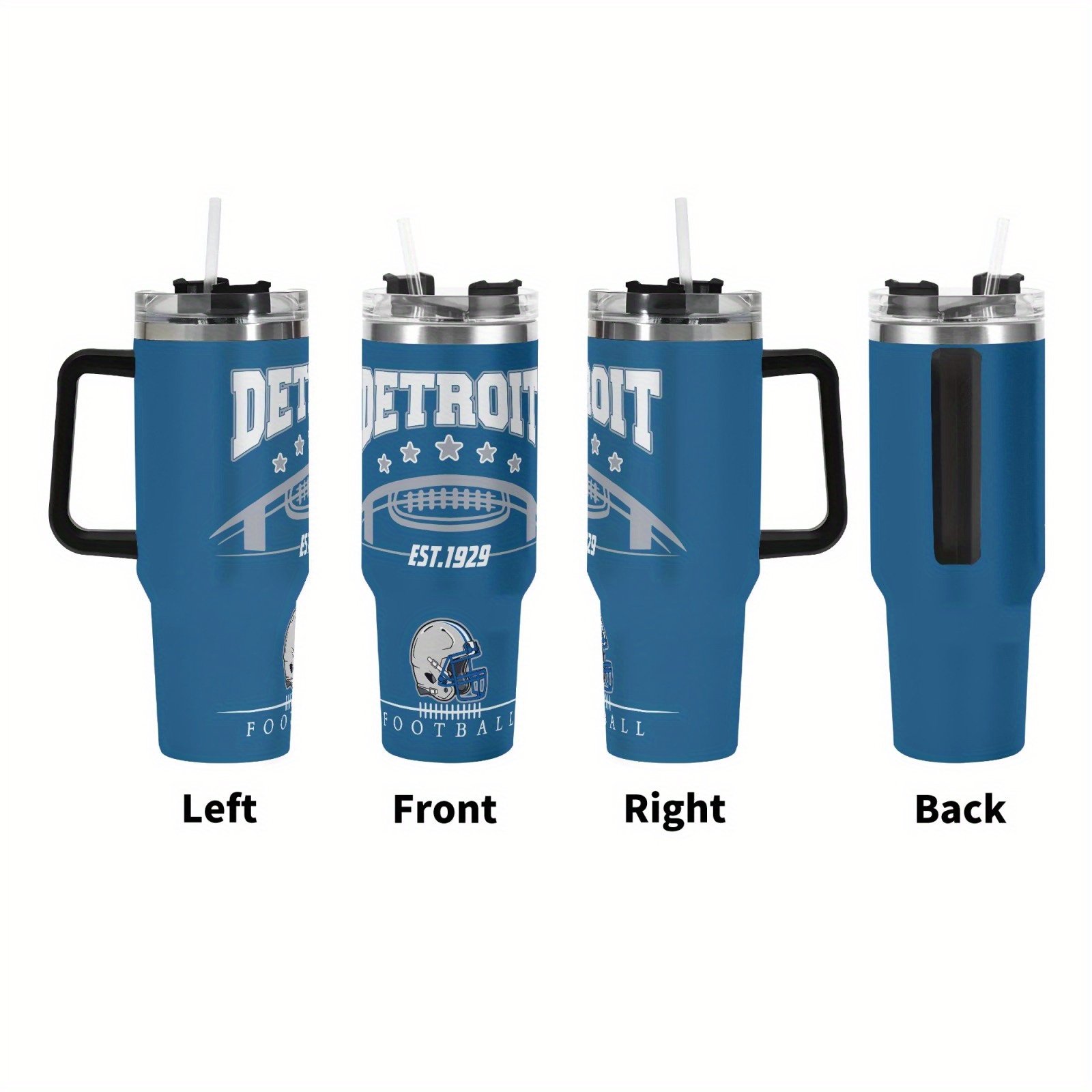 Detroit Lions Football Themed Travel Mug is a 40-oz travel mug designed for daily drink routines and football-themed outings. The style shown in the image features bold Detroit football text, helmet-style artwork, and a wrap layout that stays visible from multiple angles, including left, front, right, and back views. This makes the mug suitable for home use, office desk setups, school schedules, commuting routines, and weekend travel. The mug includes a side handle, a fitted lid, and a straw, helping support easy sipping and carry use throughout the day.