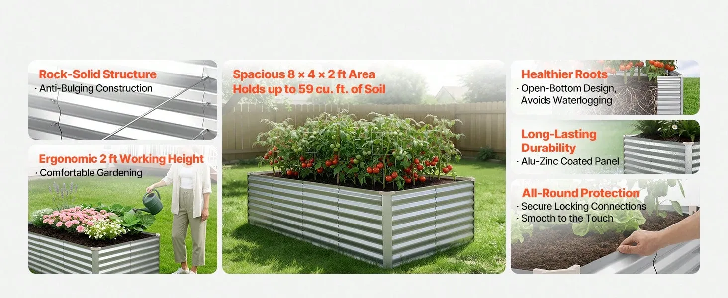 The Galvanized Raised Garden Bed Open Bottom Steel Planter Box 8x4x2 ft provides a reliable solution for outdoor planting. With its large capacity, structured design, and practical features, it supports efficient gardening for vegetables, flowers, and herbs across various outdoor environments.