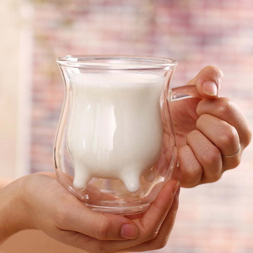 This Milk Glass Cow Cup has a double walled design that is heat resistant. The glass cup is also made of durable borosilicate glass that is long lasting and looks great! Perfect for holding beverages like milk.