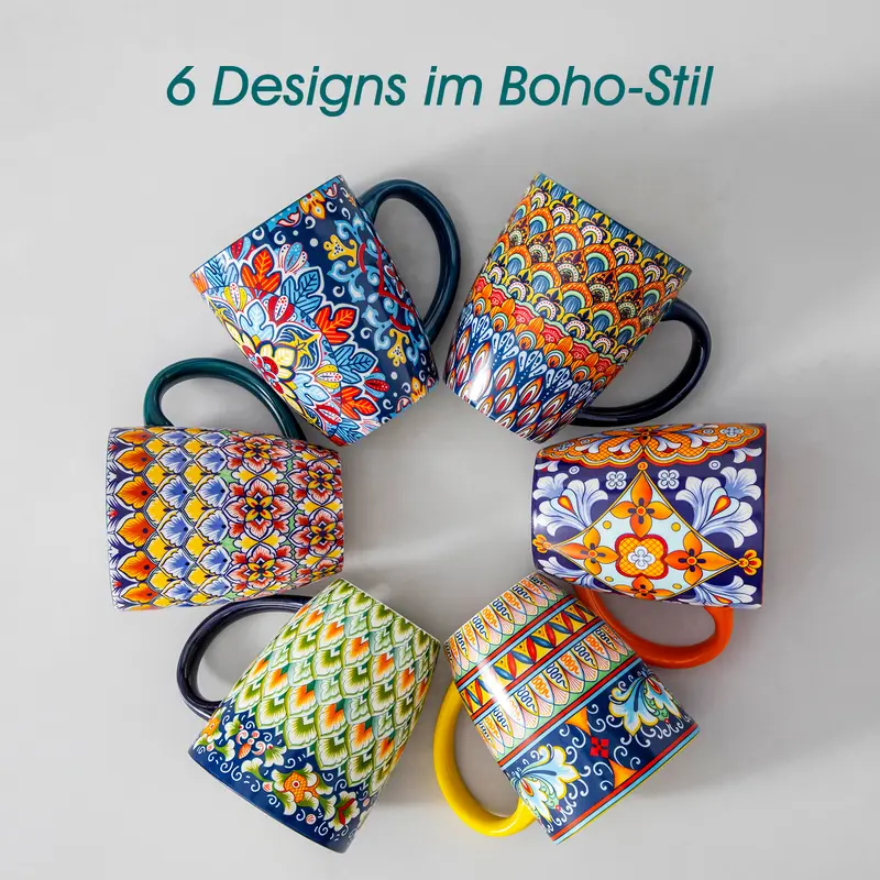The Pack of 6 Bohemian Style Porcelain Coffee Mugs combines decorative prints with functional design for everyday beverage enjoyment. With varied patterns, a generous capacity, and porcelain construction, this set fits seamlessly into daily routines while offering visual character. Suitable for home kitchens, shared spaces, or display shelving, these mugs provide a balanced blend of form and usability for regular drink service.