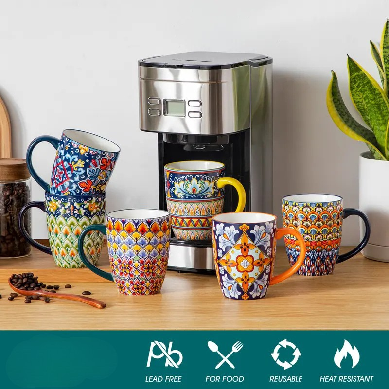 The Pack of 6 Bohemian Style Porcelain Coffee Mugs set offers visual variety while maintaining a unified design theme. Each mug carries its own patterned detail, making the set engaging without appearing mismatched. The porcelain construction supports temperature consistency for everyday beverages while maintaining a smooth exterior finish. The 16oz capacity allows flexibility for different drink sizes, and the balanced shape fits well in standard storage spaces. This set is designed for those who appreciate patterned drinkware that complements both modern and artistic kitchen setups.