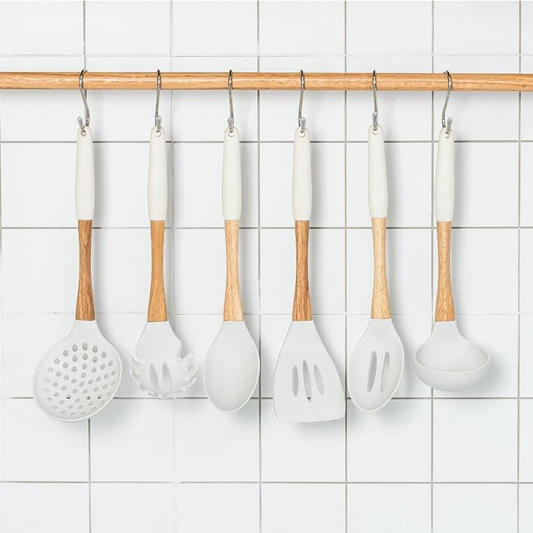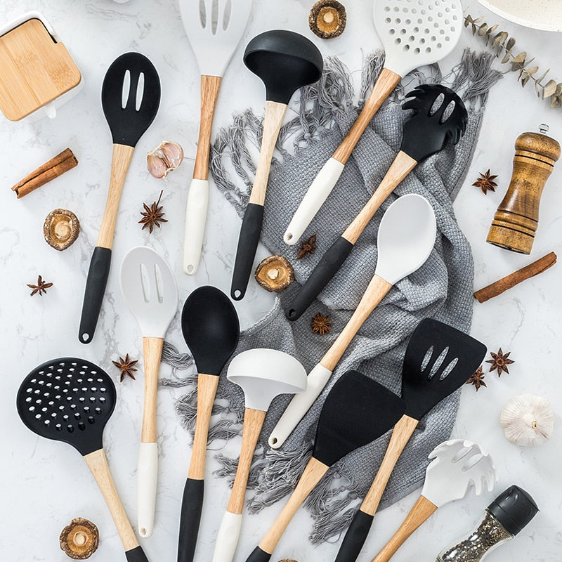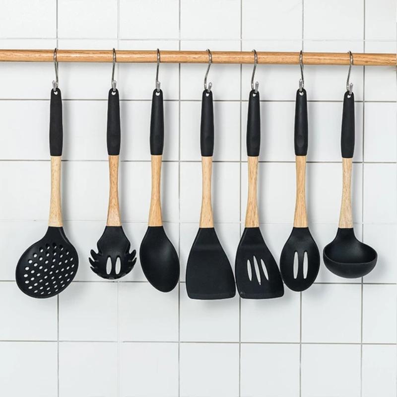 This Premium Silicone Kitchen Utensils Set includes utensils with food grade safe, FDA approved silicone and high-quality wooden handles. These utensils are high temperature resistant, with hand-polished beech handles, tough silicone heads, comfortable to touch, easy to clean, and hangable for easy storage. The perfect addition to any kitchen!