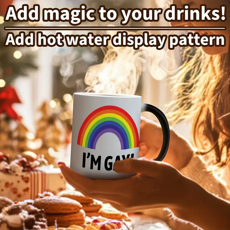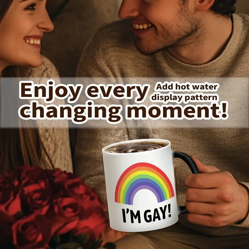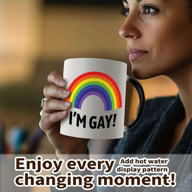 The Rainbow Pride Ceramic Mug stands out for its charm and expressive appeal. Its heat-sensitive transformation brings visual excitement with every pour. The rainbow and bold print design make it instantly recognizable and joyful.