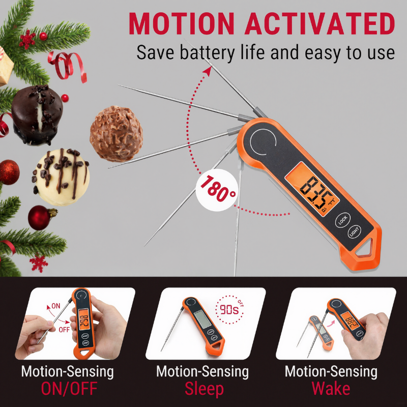 Accurate temperature measurement is crucial for preparing food safely and consistently. The digital meat thermometer provides instant readings and versatile functionality suitable for home kitchens and outdoor BBQs. Its design includes a motion-sensing feature and, auto-rotating backlit display, making it ideal for grilling, smoking, frying, or candy making.